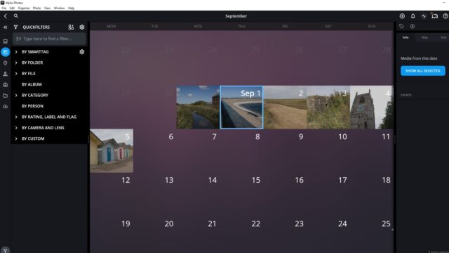 The Calendar view is handy; it shows a straightforward monthly calendar with thumbnails of photos. From here, clicking on the month reveals photos taken on different days.