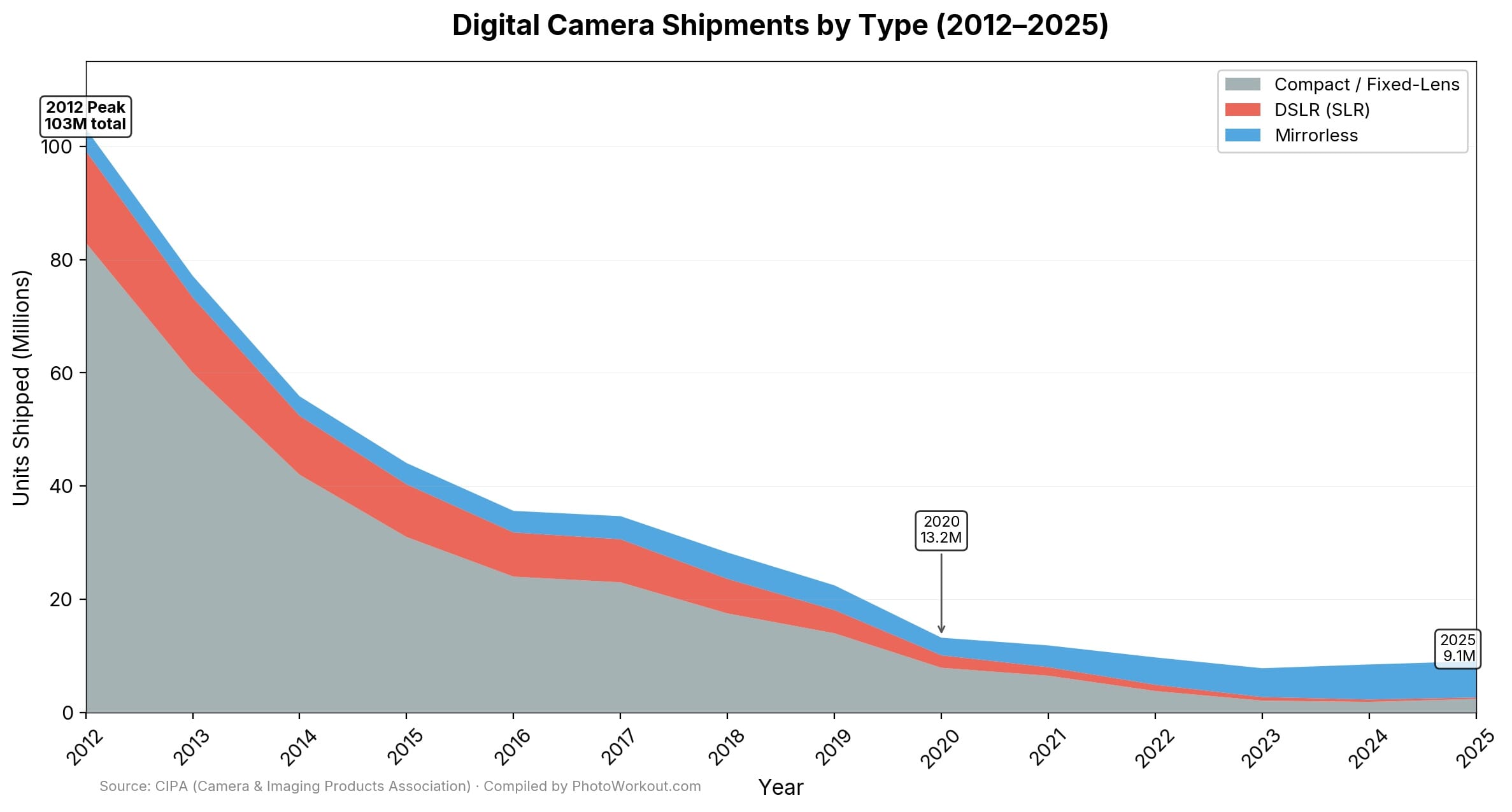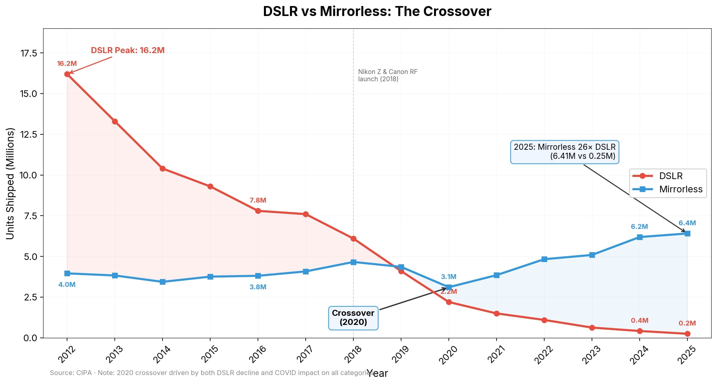 - 2012: DSLR shipments peak at approximately 16.2 million units. This was the golden age.